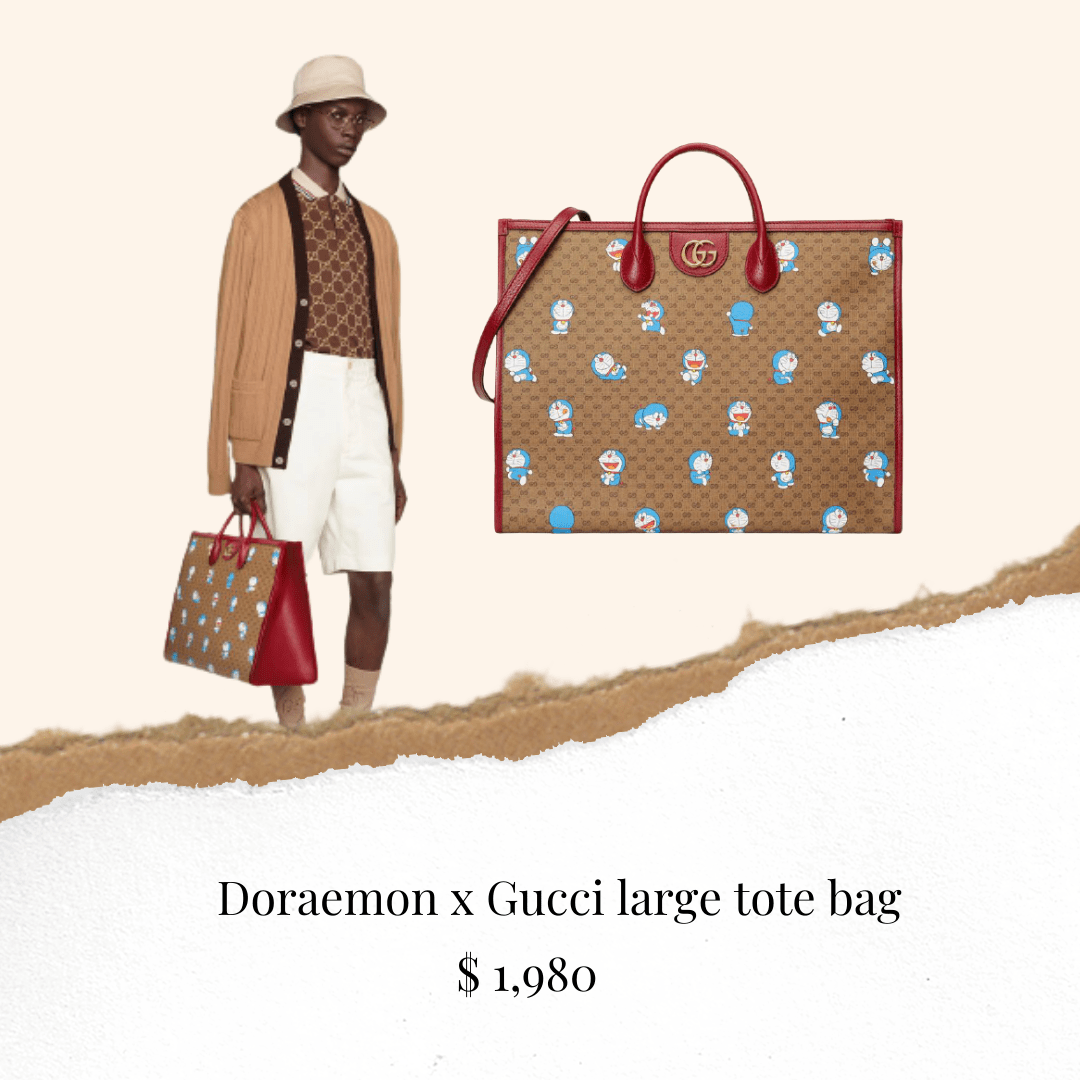 สุดท้ายแล้วกับ Item ที่เรียกได้ว่าน่าจะอยู่ในดวงใจสาวก Gucci ทุกคนอย่าง large tote bag ที่เป็น กระเป๋ารุ่นสุด popular และแสนจะ iconic ของ Gucci ด้วยทรงกระเป๋าที่ ดีไซน์มาเพื่อตอบโจทย์การใช้งาน แต่ก็ยังคงความเรียบหรูและมี class สไตล์เฉพาะตัวของ Gucci แล้ว ยิ่งนำมา collabs กับการ์ตูนในดวงใจของหลายๆคนอย่างโดราเอมอนแล้ว ยิ่งเพิ่มความน่าซื้อเข้าไปอีกมากมาย คราวนี้ถือไปไหนบอกเลยว่า ได้ลุคน่ารักแฝงความขี้เล่น แต่ก็ยังคงความเรียบหรู ดูแพง สมชื่อ Gucci แน่นอน เพราะงั้นพลาดไม่ได้จริงๆค่ะ สำหรับรุ่นนี้กับ Doraemon x Gucci large tote bag