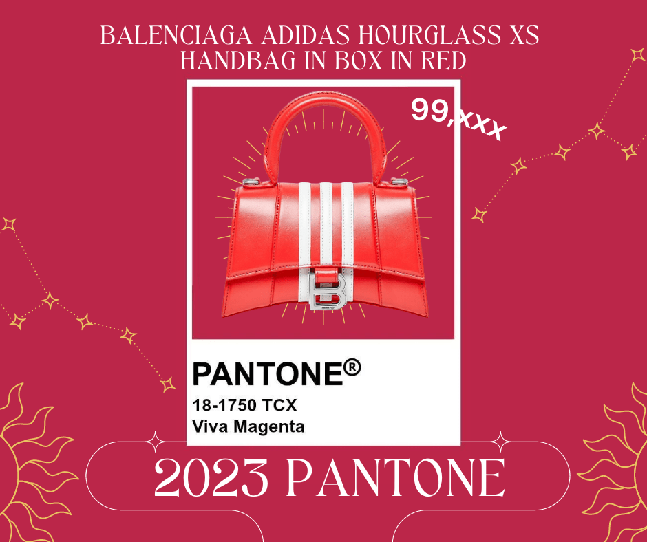 แม้ว่าสีแดงของกระเป๋าใบนี้จะค่อนข้างสว่างมากกว่าสี Viva Magenta ไปซักหน่อย แต่ว่ากระเป๋าใบนี้ถือเป็นคอลเลกชั่นพิเศษที่ทาง BALENCIAGA ได้ร่วมมือออกแบบกับแบรน์กีฬาอย่าง ADIDAS โดยกระเป๋าใบนี้ได้นำ ที่มีลาย 3 Stripe ของ Adidas มาวางไว้บนตัวกระเป๋า HOURGLASSที่เป็นเอกลักษณืของ BALENCIAGA ถือได้ว่า กระเป๋าใบนี้ถูกออกแบบโดยนำจุดเด่นของสองแบรน์ผสานเข้าไว้ด้วยกันได้อย่งลงตัวนั้นเอง