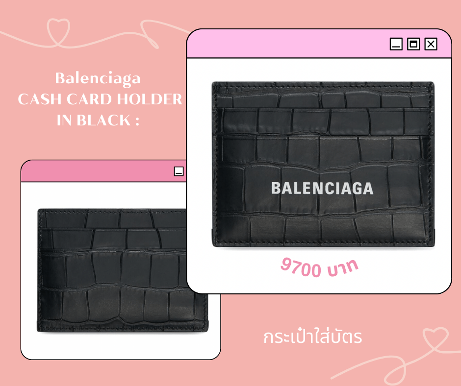 Card holder ลุคไฮด์เอนด์สตรีทแวร์ จากแบรนด์ Balenciaga ตัวกระเป๋าใส่บัตรทำจากหนังลูกวัวสีดำปั้มลายพื้นผิวแบบหนังจรเข้ พร้อมกับสกรีนยี่ห้อ Balenciaga สีขาวตัดกับสีของกระเป๋าเพื่อความโดดเด่นไม่ซ้ำใคร card holder นี้เหมาะกับการให้ในทุกโอกาสเพราะทางเราเองเชื่อว่ากระเป๋าสตางค์ของเราๆนั้นไม่พอที่จะสามารถใส่บัตรลงไปทั้งหมดได้นั้นเอง ค่าตัวของเจ้า Card holder จาก Balenciaga อันนี้อยู่ที่ 9,700 บาท