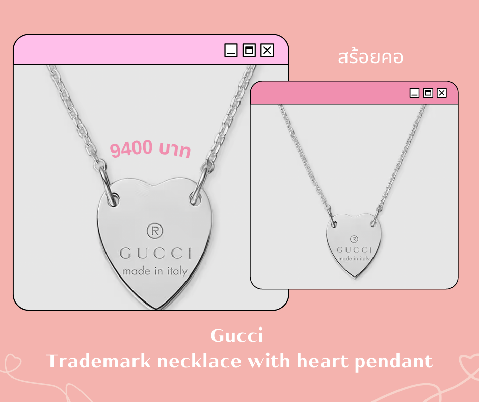 สร้อยคอพร้อมจี้รูปหัวใจจาก Gucci ของขวัญที่เหมาะสำหรับแทนคำบอกรักในโอกาสสำคัญเช่นวันวาเลนไทน์ หรือวันครบรอบ คุณผู้ชายสามารถมอบให้กับคุณผู้หญิงแทนคำสารภาพรักก็ได้ ตัววัสดุของสร้อยคอและจี้ ทำจากเงิน 925 และตัวจี้รูปหัวใจสลักยี่ห้อ Gucci และตัวรูปทรงหัวใจ ทางแบรนด์ต้องการที่จะสื่อถึงเรื่องราวของความรักและความโรแมนติก ตัวสร้อยคอพร้อมจี้อันนี้มีค่าตัวอยู่ที่ 9,400 บาท